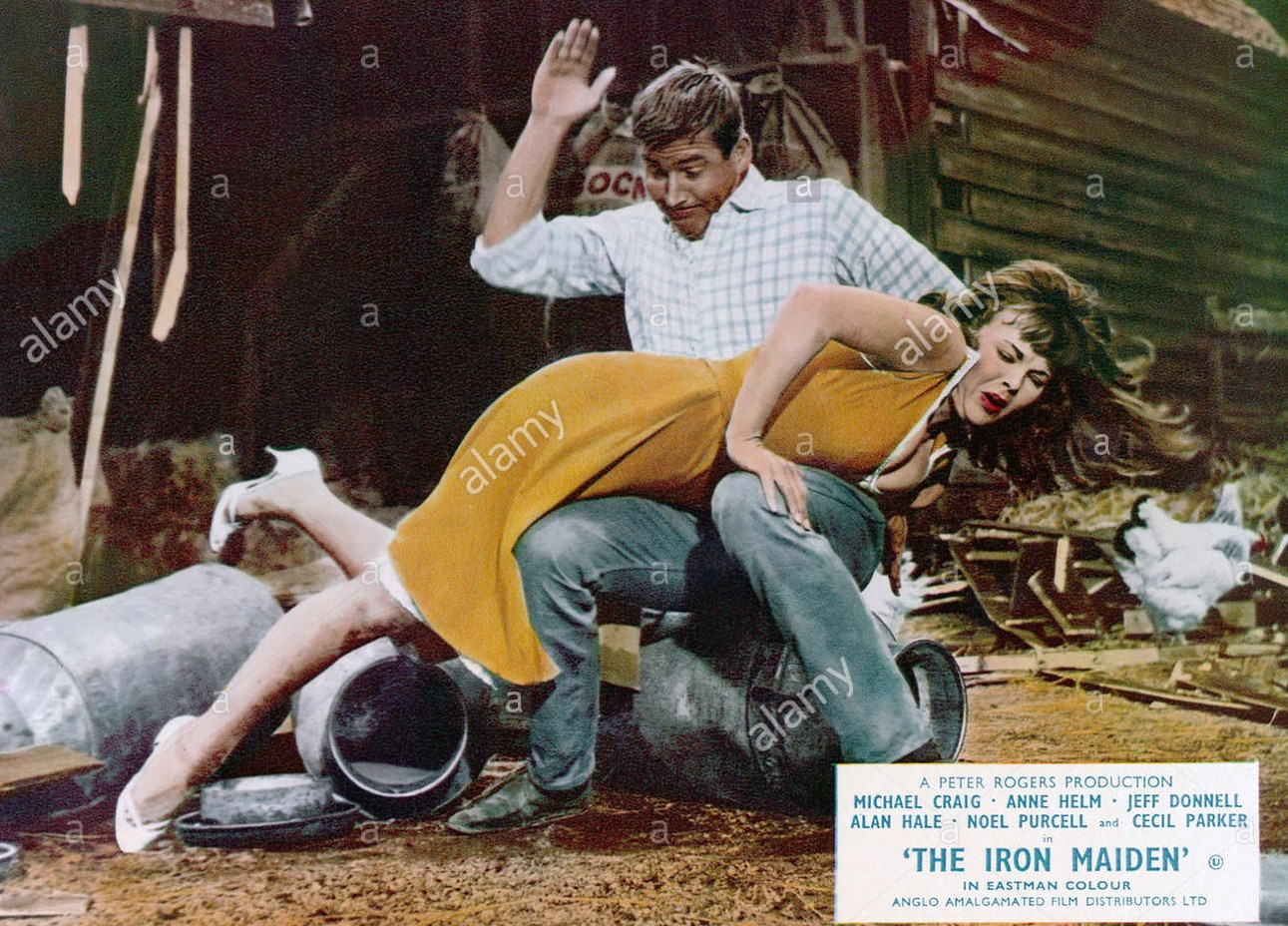 Above are lobby cards and a still for The Iron Maiden (known in the USA as The Swingin' Maiden). Look what the publicity guys do to the lobby cards and posters. The photo on the left is a screen grab. She is clearly wearing a blue dress. The Americans change the dress to the much more aggressive red. Even the British change it, in this case to the mildly agressive yellow. and the full poster pulls no punches either Michael Craig as Jack Hopkins takes Ann Helm as Kathy Fisher across his knee and spanks her backside. Seven spanks are firmly administered, all on screen.